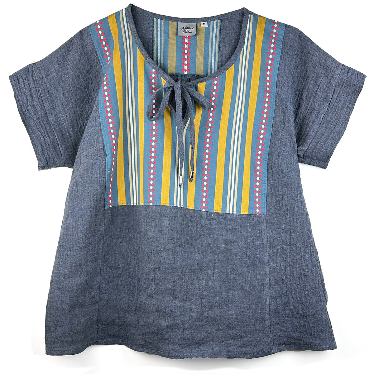 Perma-crinkle mid-weight linen blouse with cotton bib detail. Yarn dyed dot and stripe pattern. Loose fitting, popover style with a tie neck. Matching cotton from the front is pieced into the back yoke.