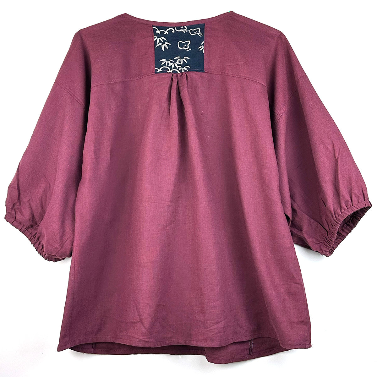 Mid-weight blouse. Wine colored cotton/linen with navy cotton bird and bamboo print. Loose fitting, popover style with a tie neck top. Matching cotton from the front is pieced into the back yoke. 3/4 length poufy sleeves with elastic cuffs.